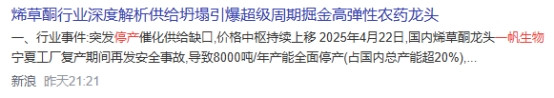行业产能格局:行业CR3超60%,此次一帆生物停产导致市场出现3个月20%的即2000吨产能缺口,叠加当前渠道库存低位,市场预期烯草酮价格将从当前7-8万元/吨跳涨至10万元/吨以上,甚至冲击历史高位(14万元/吨)。